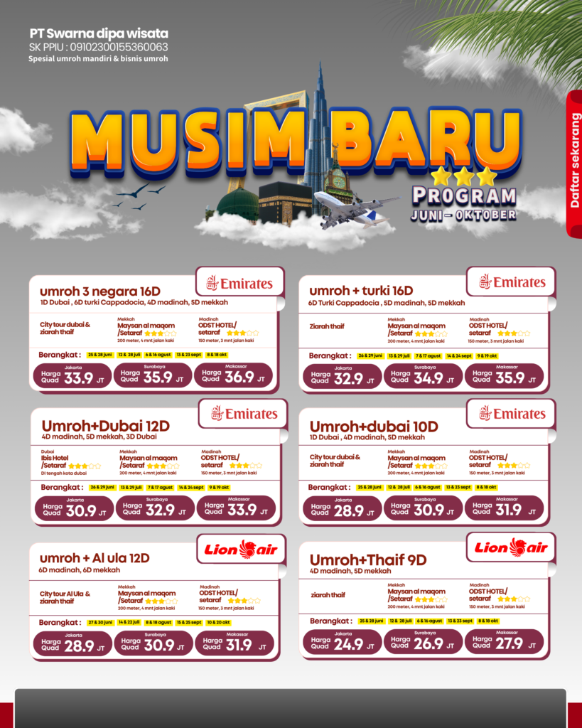 Kalau kamu mau buat paket secara reques bisa hubungi kami, nanti kami bantu untuk hitungkan kebutuhan biaya perjalanan umrohmu, pasti hemat, aman dan menyenangkan
